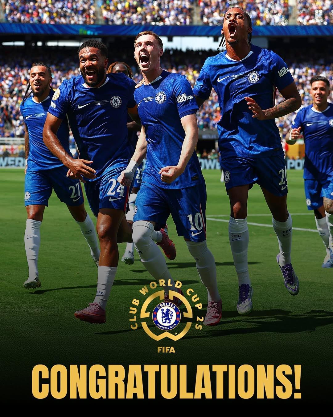 赛后,国际足联主席因凡蒂诺在社交媒体晒出了切尔西的夺冠海报,并写道:恭喜切尔西夺得2025年世俱杯冠军,并成为首届国际足联俱乐部世界杯冠军!
